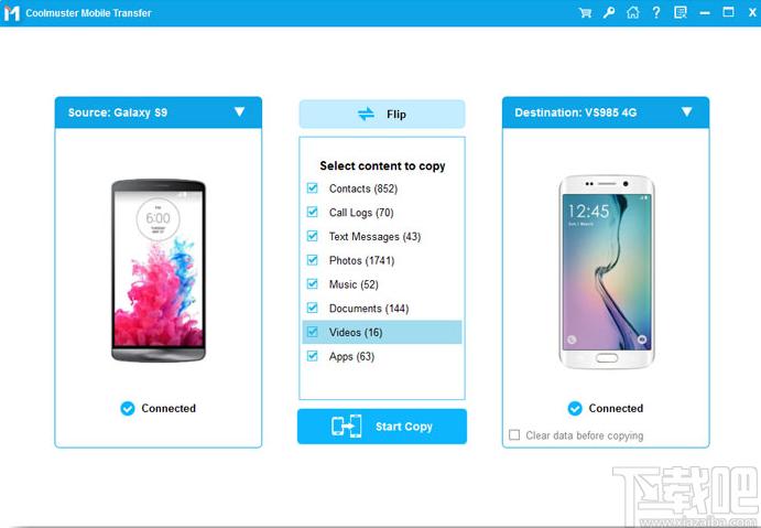 (2)选择要传送的内容。它支持联系人,呼叫日志,短信,照片,音乐,文档,视频和应用程序。如果需要,可以选中“复制前清除数据”选项以清除目标设备上的数据。然后,请单击“开始复制”按钮以开始传输过程。